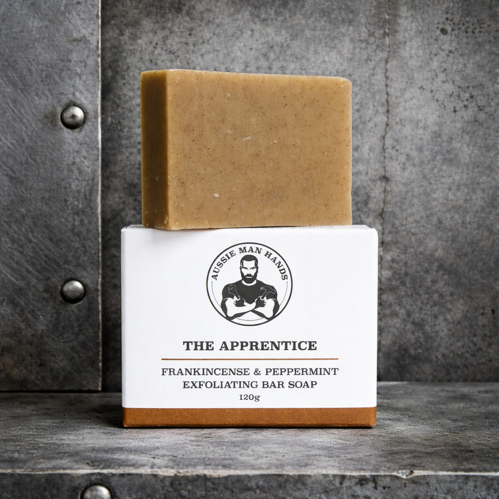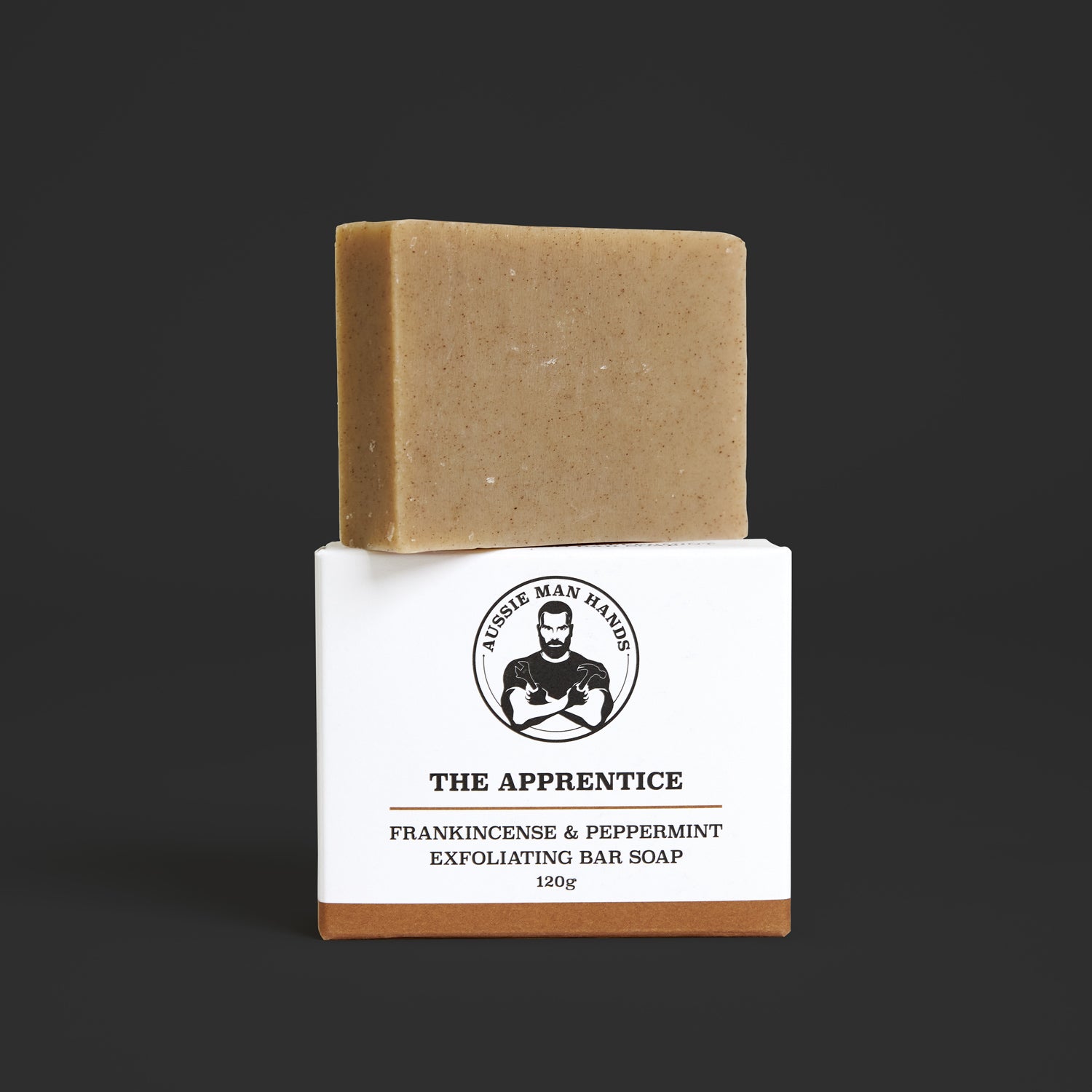 Not quite as brutal as The Boss soap but still gets the job done. You can't go wrong with The Apprentice! Our 120g soap contains saponified olive and coconut oil, Frankincense, Peru Balsam and Peppermint essential oils, sodium lactate, and gluconate. Ground macadamia nut shell acts as an exfoliate.